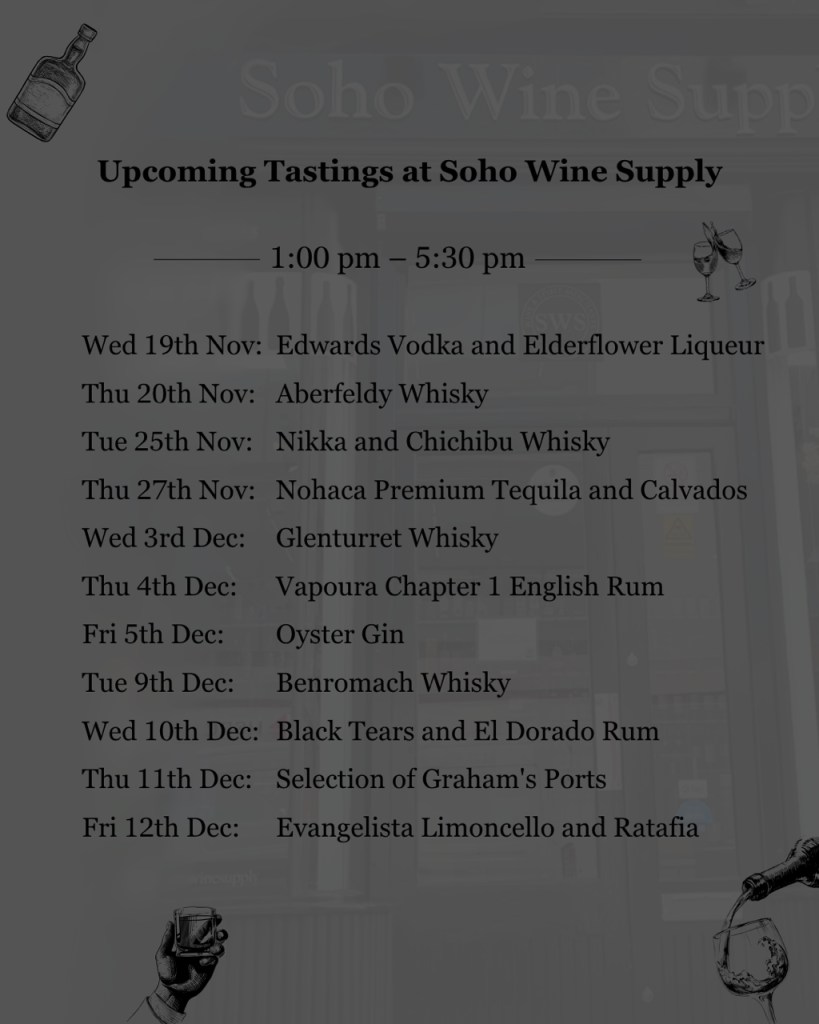 It’s already that time of year, and Soho Wine are delighted to invite you to a range of instore tastings over November and December to help inspire your Christmas shopping and get you sampling delicious drinks. From rum to ratafia, tequila to tawny port, we’re tasting wines and spirits from all over the world, and we can’t wait to see you there.
